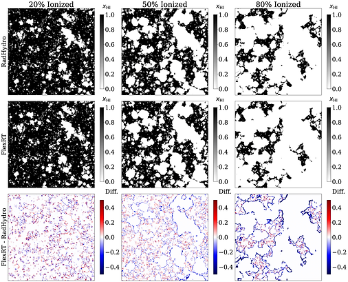 The first two columns compare maps of the neutral fraction, but through the center of the expanding HII region, in FlexRT's "standard mode" to a similar test using the C2-Ray code. The other two columns compare FlexRT's "generalized opacity mode" to the IFT code. The good agreement between FlexRT and these established codes is repeated across full landscape of tests presented in Iliev+06. The second image compares maps of the ionization field in a full-scale reionization simulation run with the RadHydro code (top row) and FlexRT (middle row). The bottom row shows difference maps. The level of visual agreement between the codes is striking, and conclusively shows that FlexRT's adaptive ray tracing scheme can efficiently and accurately simulate the growth of ionized regions, a crucial ingredient for forward-modeling nearly all reionization observables. Similar comparisons also demonstrate that FlexRT accurately captures the growth of and fluctuations in the ionizing background during and after reionization. Check out the linked studies for more details.